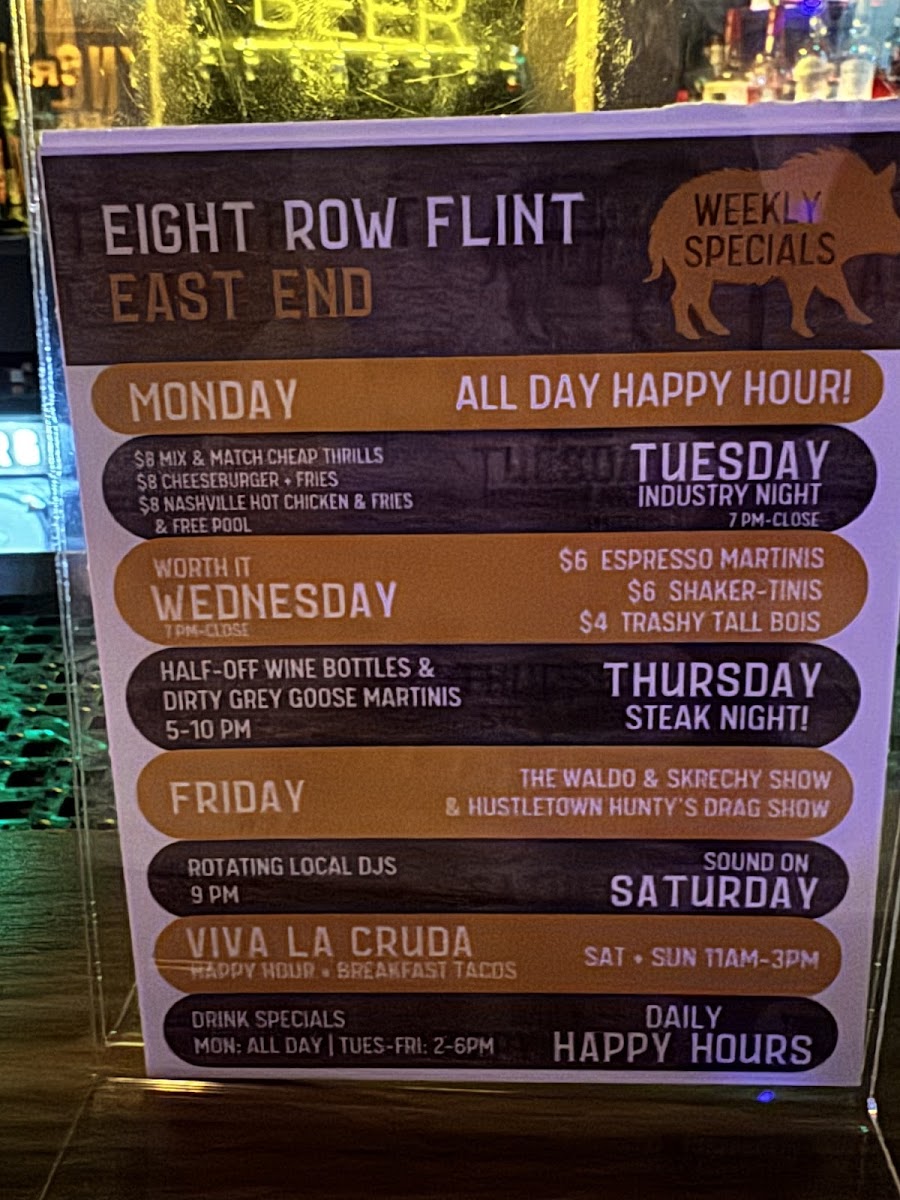 Welcome to Eight Row Flint East End, a hidden gem located at 3501 Harrisburg Blvd Suite A in the vibrant city of Houston, TX. This eclectic bar and eatery combines a lively atmosphere with a menu that surprises even the most discerning food enthusiasts. Known for its rotating local DJs on Fridays, it's not just a place to grab a drink; it's a culinary destination where good times and great flavors intersect.